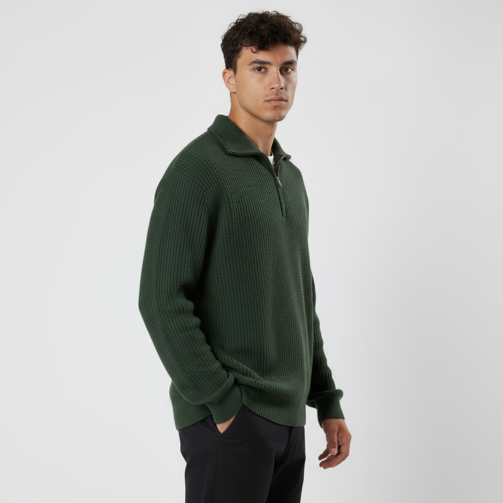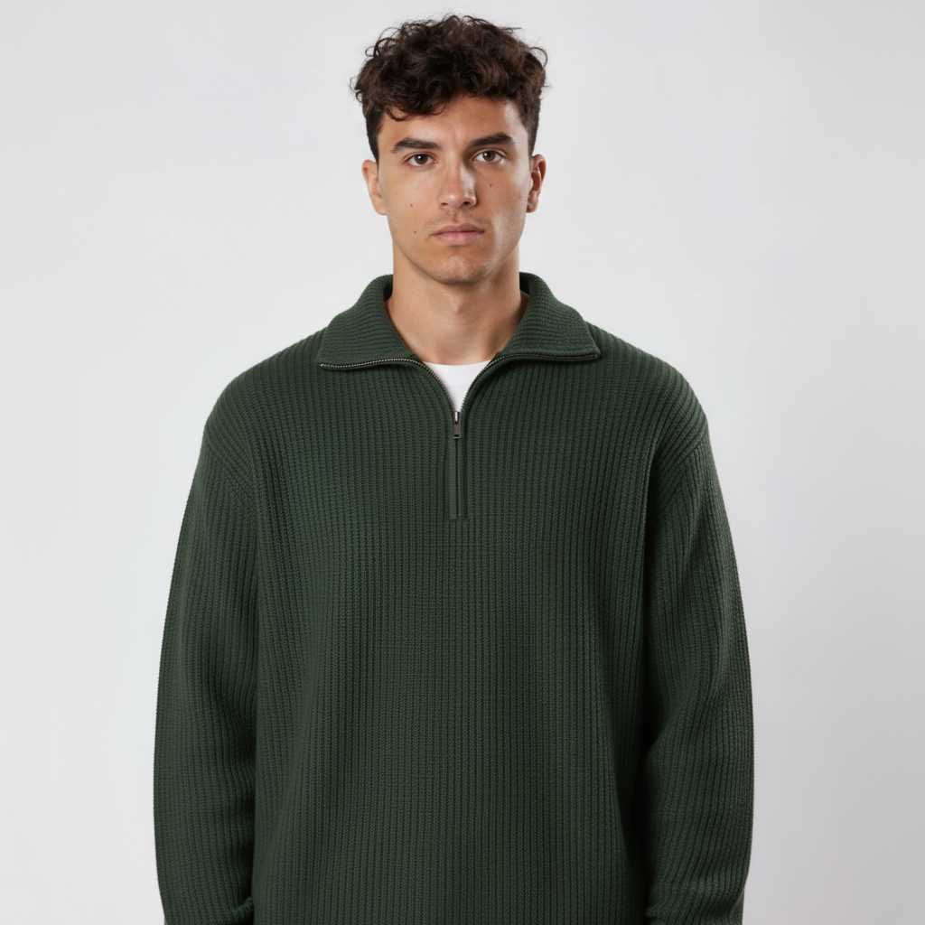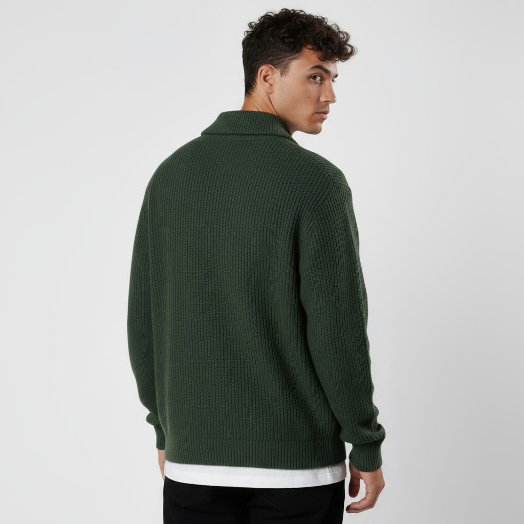 Su tono verde oliva profundo evoca los bosques del sur y el estilo clásico europeo, mientras su cuello polo con cierre metálico aporta un aire moderno y refinado. El corte relajado, junto con la caída estructurada, lo convierte en una pieza versátil para combinar con camisas, pantalones de lino o jeans.